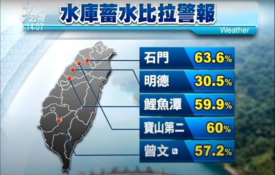 不只林口,同樣是石門水庫供水區的桃園縣,下周一也要開始夜間減壓,總計影響78萬戶,而除了石門水庫蓄水百分比只剩63%,明德甚至只有30%,鯉魚潭、寶山及台南的曾文水庫水情也不樂觀。因此12月1日起限水也會擴大。