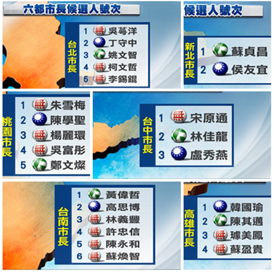 The result of the draw for candidates running for mayors of Taiwan's six major cities are as follows: in New Taipei, DPP candidate Su Tseng-chang received the No. 1 lot, and KMT candidate Hou You-Yi got the No. 2 lot. For Taoyuan mayor, independent candidate Chu Hsueh-mei receive the No. 1 lot, KMT Candidate Apollo Chen received No. 2, independent candidate Yang Li-huan got No. 3, Wu Fu-tong, also independent, received the No. 4 lot, and incumbent Taoyuan City mayor Cheng Wen-tsan got No. 5. For Taichung city mayor, independent candidate Sung Yuan-tung drew the No. 1 lot, incumbent mayor Lin Chia-lung received No. 2, and KMT Candidate Lu Shiow-yen received the No. 3 lot. Tainan saw the biggest number of candidates, with the No. 1 lot going to DPP candidate Huang Wei-cher, KMT candidate Kao Su-po got the No. 2 lot, No. 3 to No. 6 respectively went to Lin Yih-Feng, Hsu Chung-hsin, Chen Yung-ho and Su Huan-chih, all are independent candidates. For Kaohsiung city mayor, KMT candidate Han Kuo-yu got the No. 1 lot, DPP candidate Chen Chi-mai got No. 2, No. 3 and No. 4 lot went respectively to Chu Mei-feng and Su Ying-kui, both independent candidates. DPP candidate Chen Chi-mai arrived at the drawing event on an electric scooter, expressing his hope to improve the air quality for Kaohsiung City.