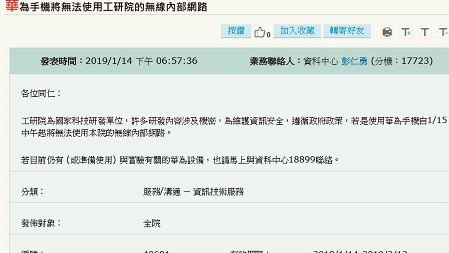 The Industrial Technology Research Institute has become the first domestic entity to take action against Chinese multinational Huawei. Due to growing concerns about the security risks of using Huawei-manufactured products, the ITRI issued an internal memo saying that employees with Huawei phones would no longer be able to access its wireless network starting at noon on Jan. 15 on the grounds of safeguarding information security.