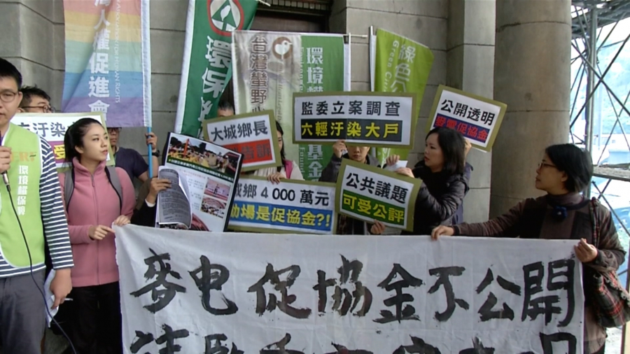 高舉白布條與標語,環保團體代表來到監察院陳情,呼籲監委調查,麥寮電廠賣電給台電,得到促協金,要再回饋地方,其中彰化大城鄉鄉長蔡鴻喜在競選時的文宣上,寫著麥電捐贈4000萬元促協金,要蓋多功能活動中心,環團認為這筆錢理當是向居民買汙染權的補償費,但錢怎麼用不公開,居民更無從參與討論。