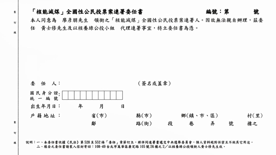 以核養綠領銜人 黃士修表示:「透過民法第十章的委任章節,我們就可以親簽一分委任書,授權給代理人,如果中選會官員委員們,因為反核團體今天記者會,做出決議說這分委任書違法,他們不承認,這件事情,我們就有得爭了!」