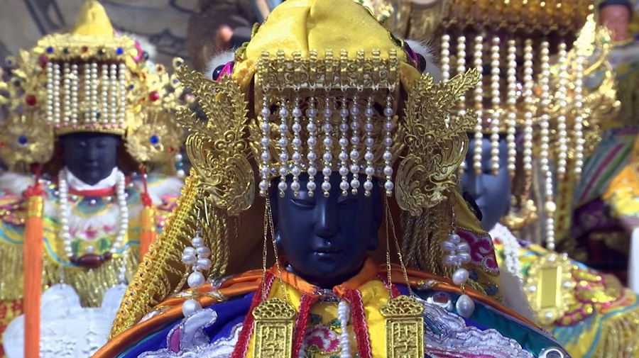 Mazu's golden crown is a work of art with a dragon and phoenix and suspended pearls. This type of headgear is only worn by deity sculptures and many are made of metal. The crown worn by Mazu at Chiayi's Peitien Temple, however, is made of paper.