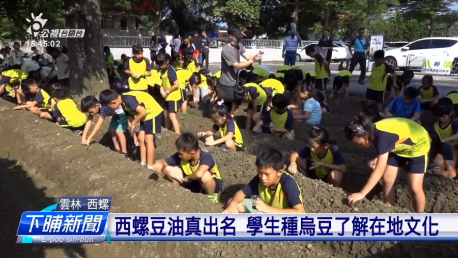 雲林西螺文昌國小的學生,手提烏豆的子,準備欲共烏豆種佇學校的田裡。透過種烏豆的過程,一直到收成,會使予囡仔閣較了解農民的辛苦。因為好的烏豆是做好豆油,上重要的頭一步。