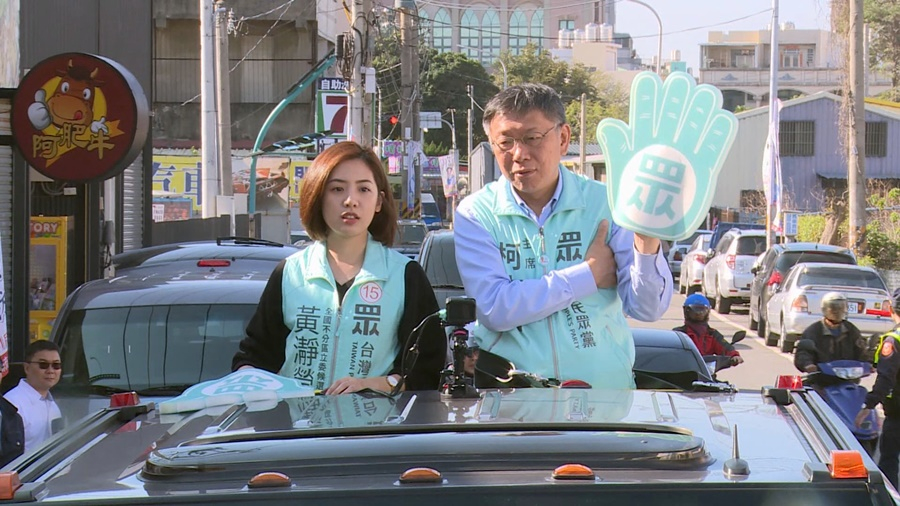 Taiwan People's Party Chairperson Ko Wen-je and legislator-at-large nominee Huang Ching-ying ride a campaign vehicle and appeal to the public to vote for the TPP on the political party ballot as the vehicle travels through Changhua County's Hemei Township. Ko was asked about reports that Yang Hui-ju, who is under investigation for paying an Internet army to influence public opinion, applied for subsidies from the central government and from the Taipei City Government. He said his remarks are based on evidence, and expressed his hope that the central government will cooperate with the investigation.