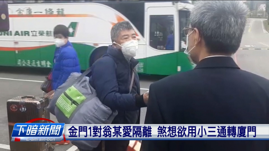 佇金門下晡、出現一對翁仔某,本底愛佇厝內隔離14工,煞偷走出來,想欲利用小三通轉去中國廈門。予人煩惱小三通會變做防疫的空縫。金門小三通對2月開始,往回金門、廈門的船幫、對40幫改到賰8幫,金門縣長楊鎮浯,強烈呼籲,認為中央愛隨停止小三通。