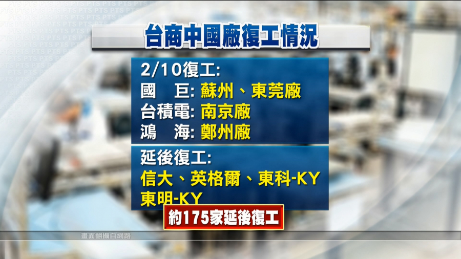 不過,還是有部份台商不受影響,2月10號如期開工,被動元件大廠"國巨",獲得大陸主管機關核准,蘇州廠、東莞廠10號確定復工,另外,台積電南京廠,也如期復工,至於鴻海集團,根據路透社報導,已接獲中國政府批准,同意在鄭州廠復工。而深圳廠,仍在爭取復工中。至於宣布延後復工的台資企業,約有175家,而且還會繼續增加。