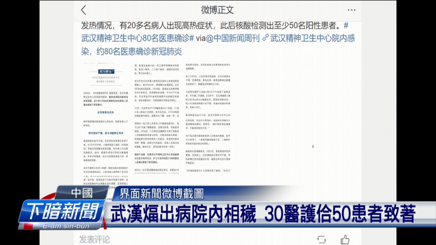 另外,中國新聞周刊報導,武漢市精神衛生中心爆發院內感染,至少有50名患者與30名醫務人員,確診武漢肺炎。