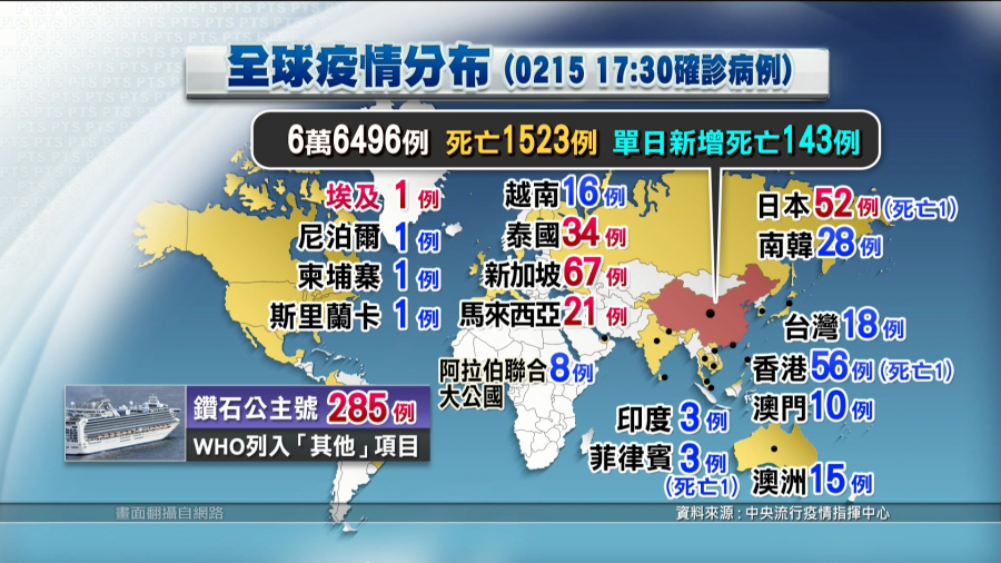 埃及出現頭一例武漢肺炎確診病例,表示全世界五大洲攏著災。靠佇日本的「鑽石公主號」遊輪,閣加67个病例,目前規隻船計共有285例。目前中國無包括港澳,確診病例有6萬6496例,死亡有1523例,全球總死亡人數是1526人。另外,目前日本有52例確診、1个人死亡。曷泰國34例,新加坡67例。臺灣維持18例,香港56例,澳門10例,澳洲15例。