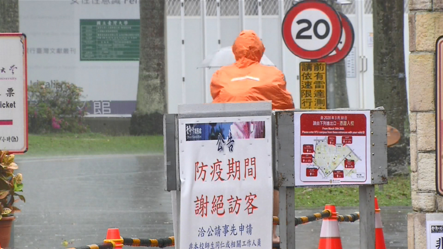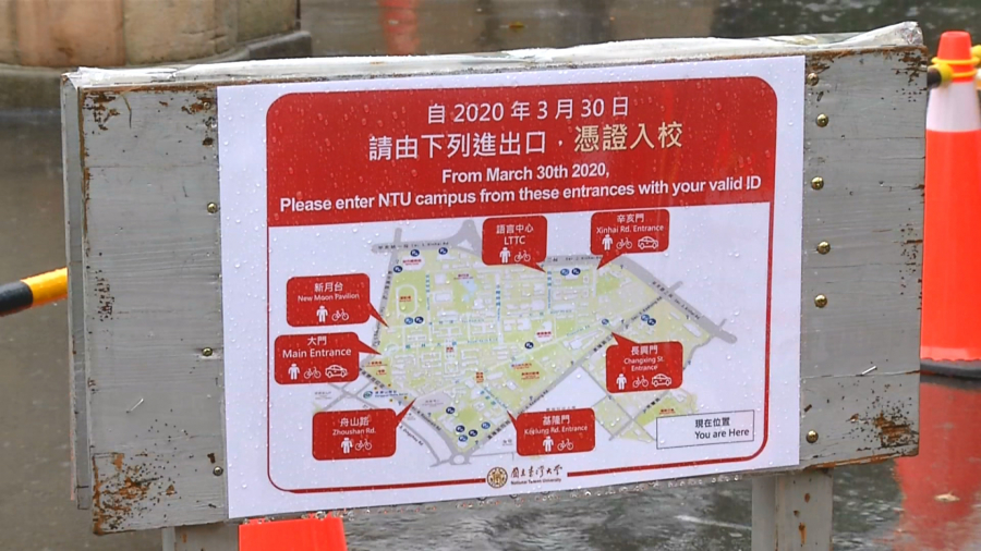 校門口張貼訊息,從3月30號開始,台大實施進一步的校園管制。防堵疫情擴散,部分大專校院實施門禁管制,台大在中研院傳出確診個案後,採取因應措施,除了交通車暫停、採用遠距教學之外,在3月8號到22號期間,如果有師生前往中研院,還要自主健康管理。