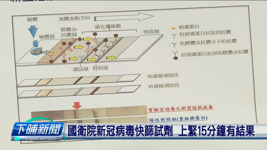 目前若欲檢驗新型冠狀病毒,是愛入去實驗室,經過核酸檢測,結果,上無著等4點鐘。抑「國家衛生研究院」和國防醫學院合作,已經研究出「快速的檢驗劑」,15分鐘就有結果,今是當欲共技術,轉移予民間落去生產;抑另外也有一間公司,經過科技部輔導,已經有12分鐘就會當驗出病毒的技術,正確的比例閣達到九成。