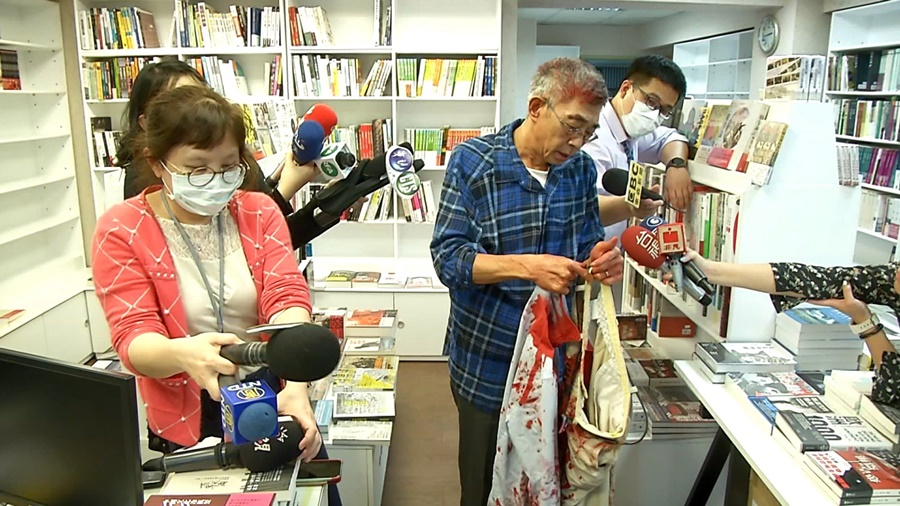 中山銅鑼灣書店店主 林榮基表示:「(被)潑紅油(漆),現在要報警。要去在警察局裡面,要錄口供嘛,我又不是沒見過共產黨,這些很明顯,就是幫共產黨做事的人做的。」