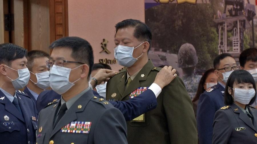National Defense Minister Yen De-fa presents Hsieh Ching-hua with the star that symbolizes his promotion to major general. Hsieh currently serves as the director of Vice President William Lai's security detail. He speaks English, has international bodyguard credentials, and previously underwent combat training at Academi. He was promoted from colonel to major general, a decision which has been controversial. This is because it was reported that Hsieh previously failed a physical, and the military arranged for him to do an easier make-up exam where the 3,000-meter run was replaced with a 5-kilometer speed walk.