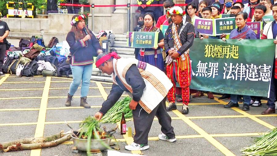 布農族獵人王光祿因為持獵槍狩獵保育類動物,遭到判刑,因此聲請釋憲。今天大法官開庭審理,全案的聲請人,除了王光祿,還包括卑南族人潘志強,以及多名法官,要針對原住民族的狩獵文化和自製獵槍等議題,進行言詞辯論。一大早,就有多個原住民聲援團體到場聲援,並透過升起狼煙的方式,希望傳遞狩獵文化無罪、法律規定違憲的訊息。