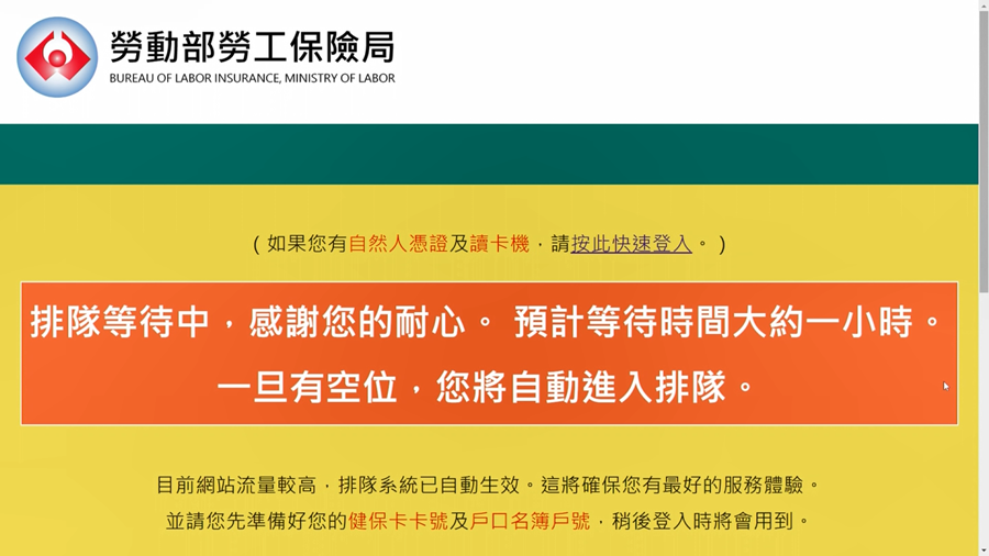 想看自己有沒有符合紓困申請標準,結果到勞保局網站查,至少要等一小時,但這還不算久,因為有些人要等超過一天。