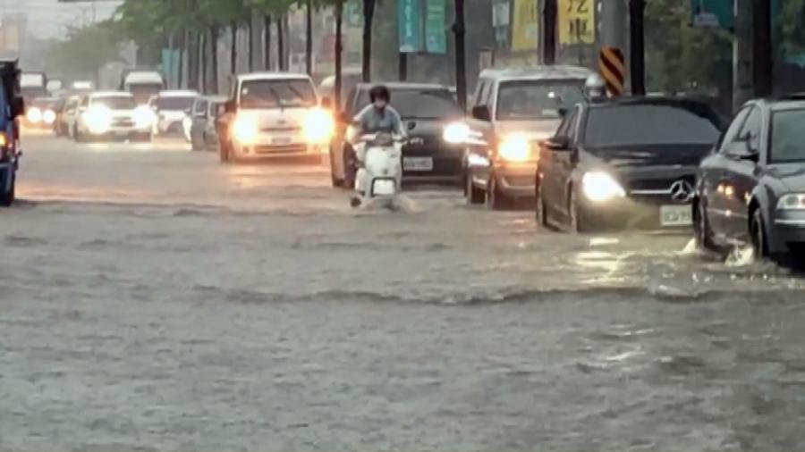ที่ถนนจงซาน ในเมืองจางฮั่วน้ำท่วมสูงถึงครึ่งล้อรถยนต์ รถหลายคันเสี่ยงขับฝ่าออกไป ส่วนที่ถนนหนานชาง รถจำนวนมากแช่อยู่ในน้ำ