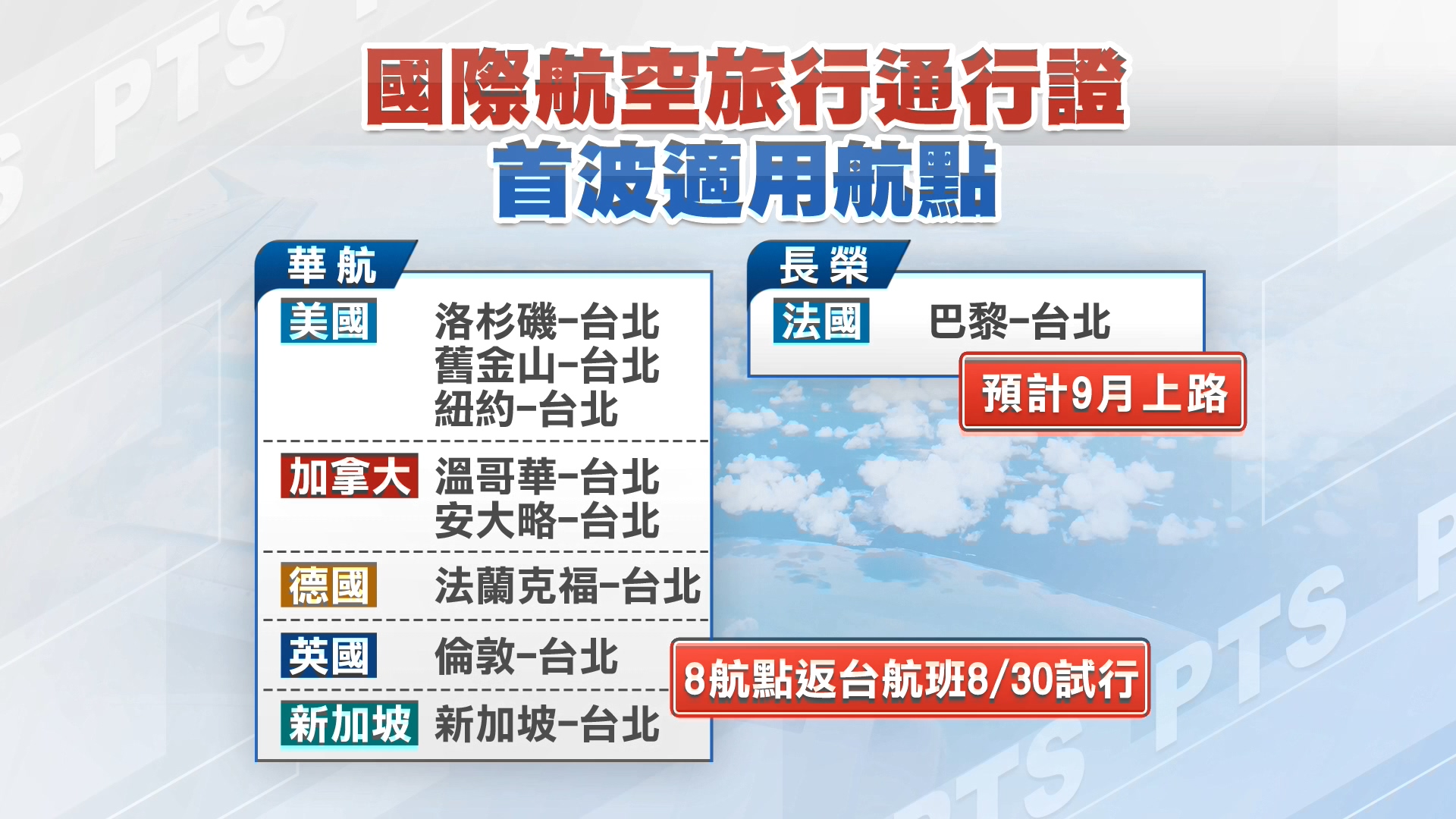 華航宣布,將試行國際航空運輸協會「IATA Travel Pass旅行通行證」,導入健康數位驗證程序,規劃美國洛杉磯、舊金山、紐約,加拿大溫哥華、安大略,以及德國法蘭克福、英國倫敦、新加坡, 8個航點返台航班,預計8月30日啟用。另外長榮航空也宣布,將於巴黎往台北航線試行,預計九月上路。