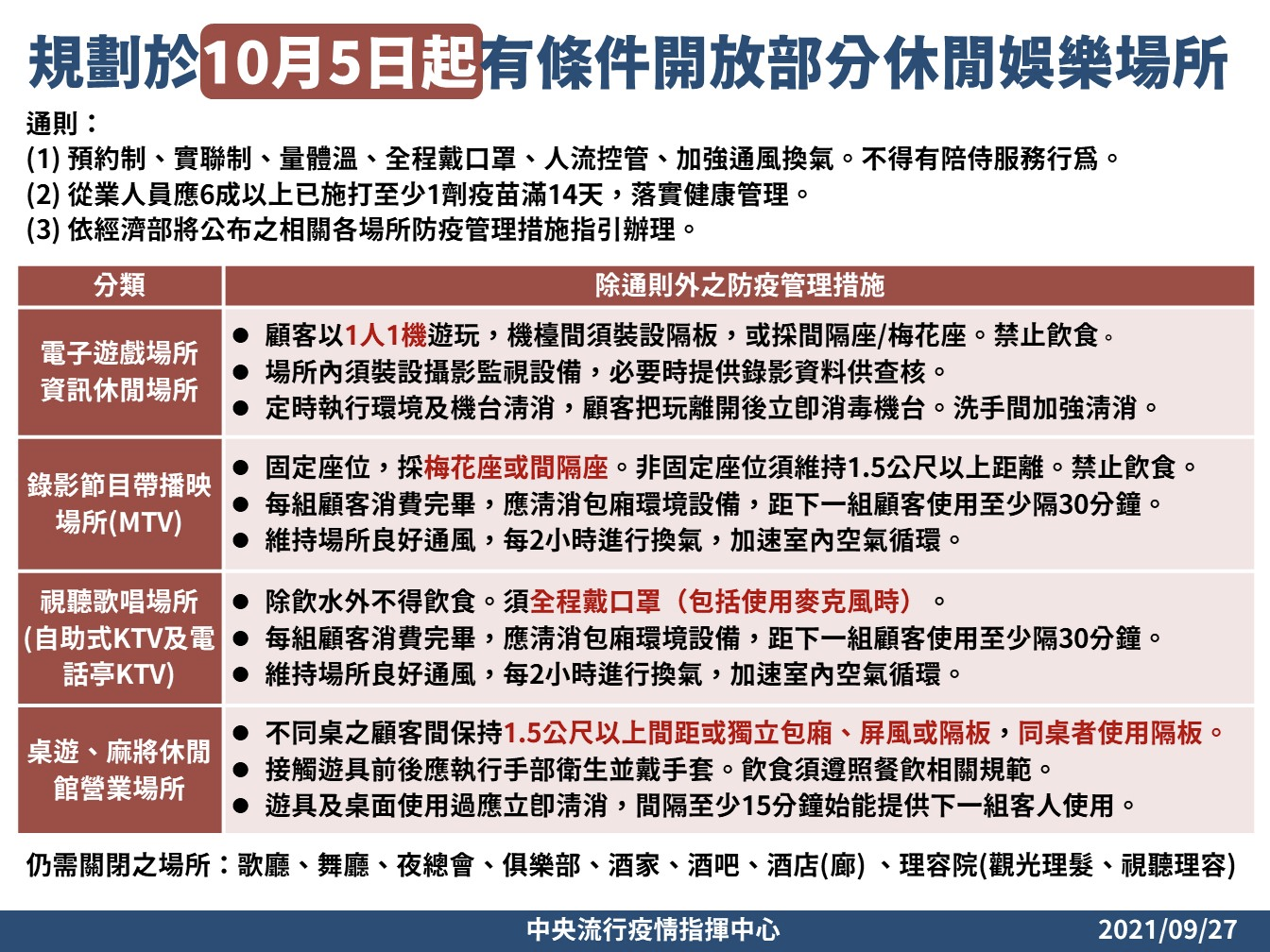 而10月5日有條件開放部分休閒娛樂場所,陳時中說明,電子遊戲場所及資訊休閒場所須以1人1機遊玩,並設置隔板或梅花座,禁止飲食。另外針對MTV、KTV等場所,則須定時清消包廂環境設備,保持場所良好通風,在使用麥克風時全程戴口罩。不過歌廳、俱樂部、酒吧等場所仍持續關閉,未來將視疫情及疫苗施打情況滾動式調整。