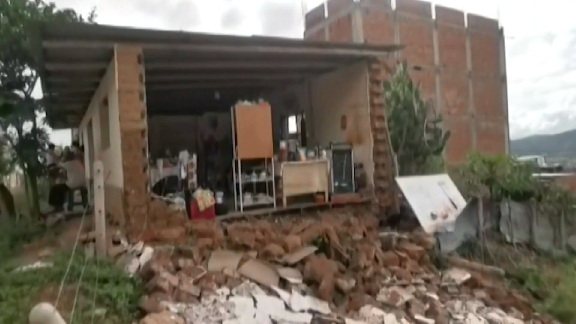 房子劇烈搖晃,底座很快冒出塵煙,並可聽到屋內傳出巨大的碰撞聲,附近居民發現有地震,紛紛往外衝,驚慌之餘再回頭,房子已經倒塌。