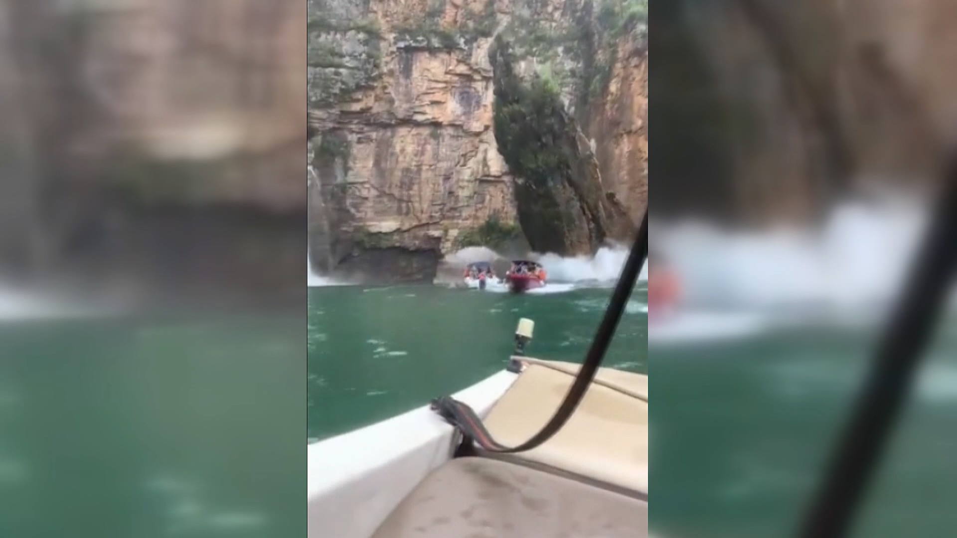 觀光船開在湖上遊覽風景,沒想到下一秒山壁崩塌,巨石直接砸中船隻,掀起巨大水花。巴西知名觀光景點「福爾納斯湖」8日發生嚴重意外,總計造成7人死亡,超過30人受傷。