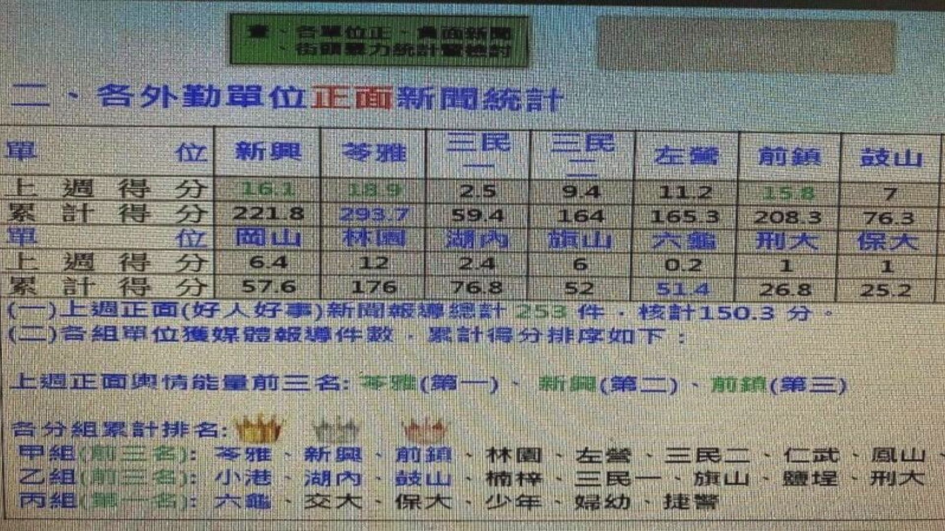 Leaked Kaohsiung City Police Department documents show the department keeps track of the number of positive news reports published, with officers getting one point for every online report and four times the points for front-page headline stories in the three major dailies. Stations are also ranked by number of points. Police rights groups say officers are under so much pressure to get the media attention that they don't think twice about releasing names, recordings and other confidential case information to the media.