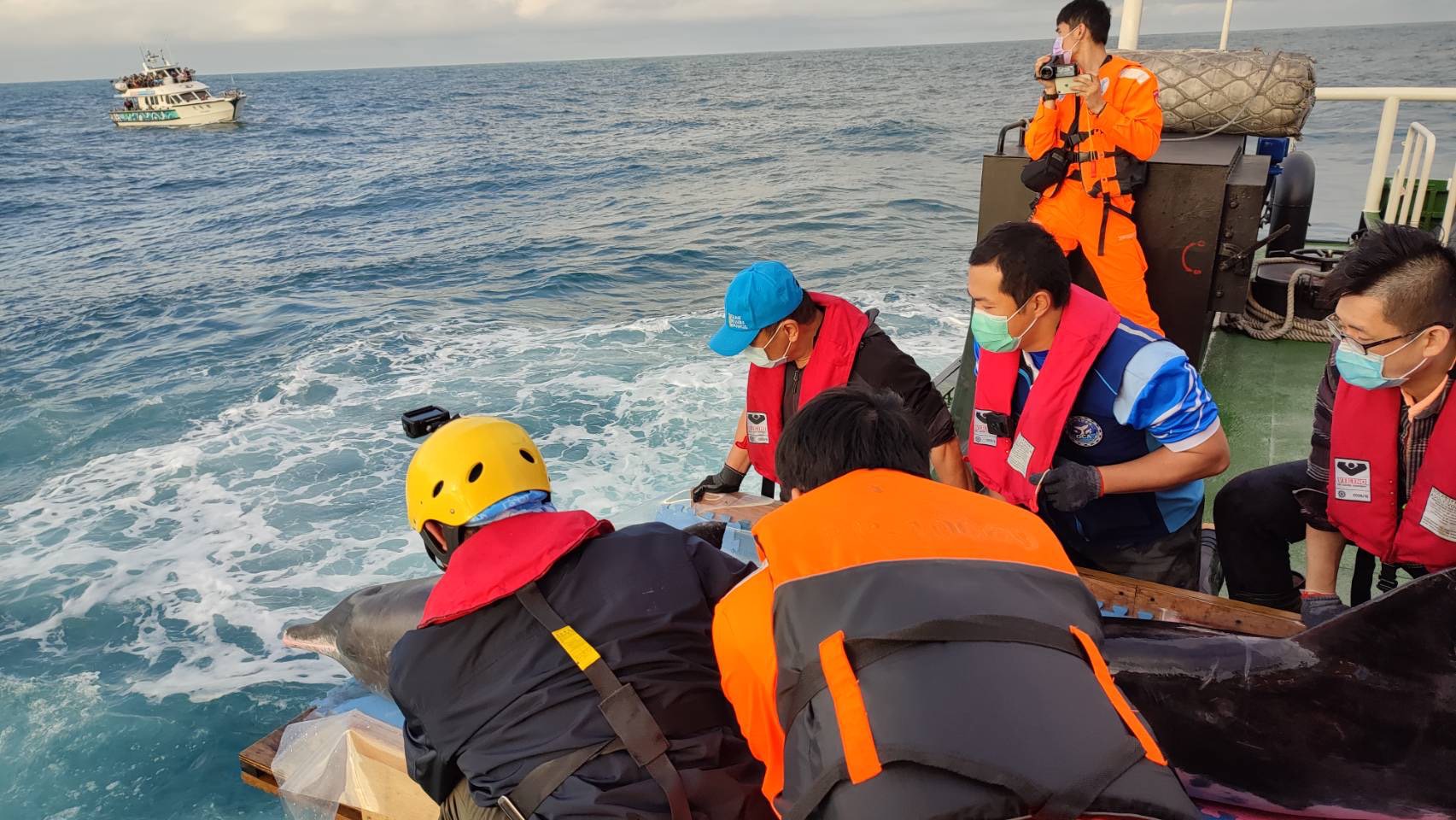 所幸釣客發現後,立即通報相關單位,也讓各單位專家得以迅速集結與協助,另外,中華鯨豚協會號召眾多志工,接力投入冰冷的海水池中,協助海豚呼吸。