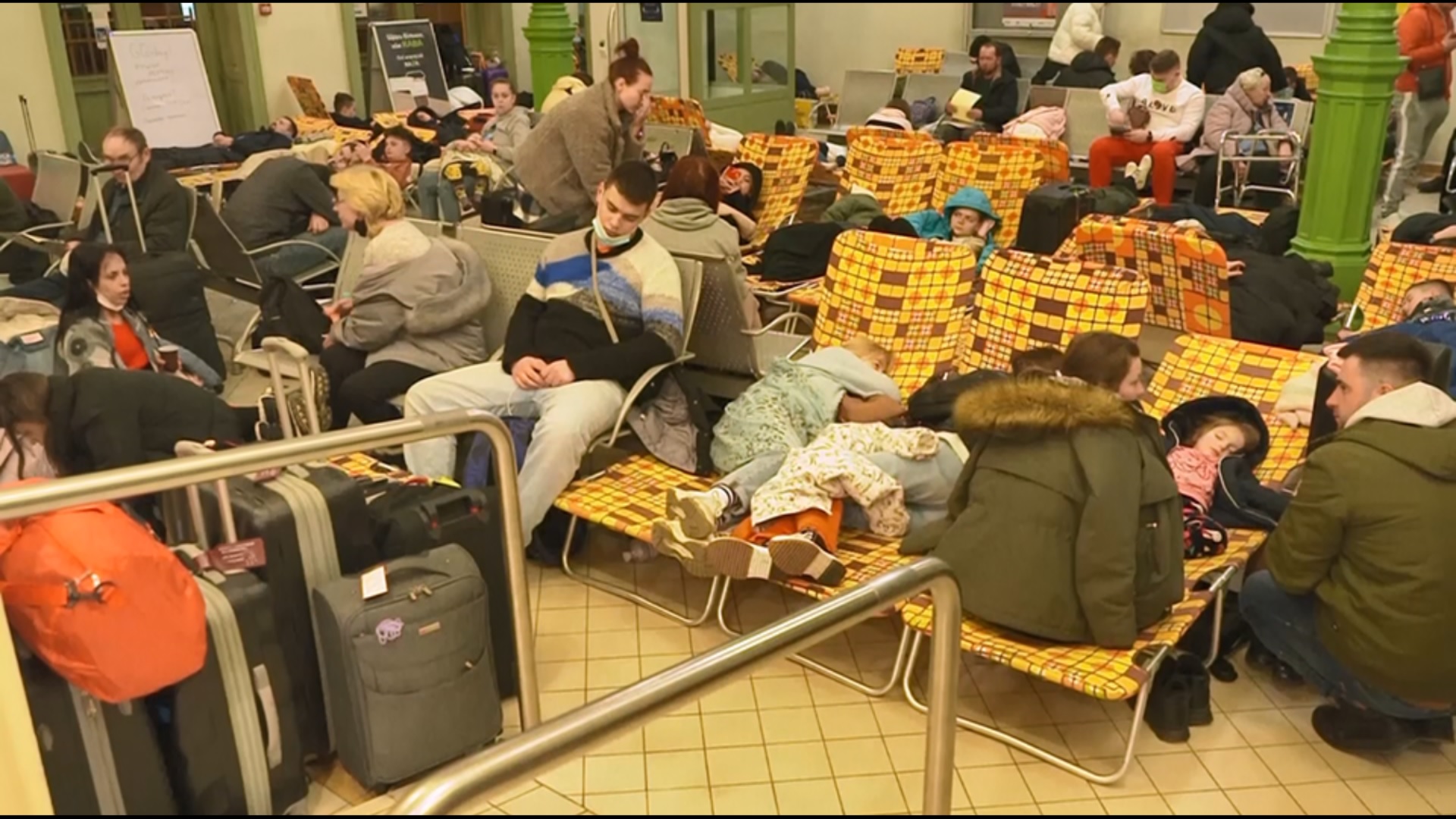 位於波蘭東南方普熱梅西爾的車站內,24號晚間湧入大批來自烏克蘭民眾暫時過夜,與戰爭的距離如此靠近,波蘭民眾也感到不安。