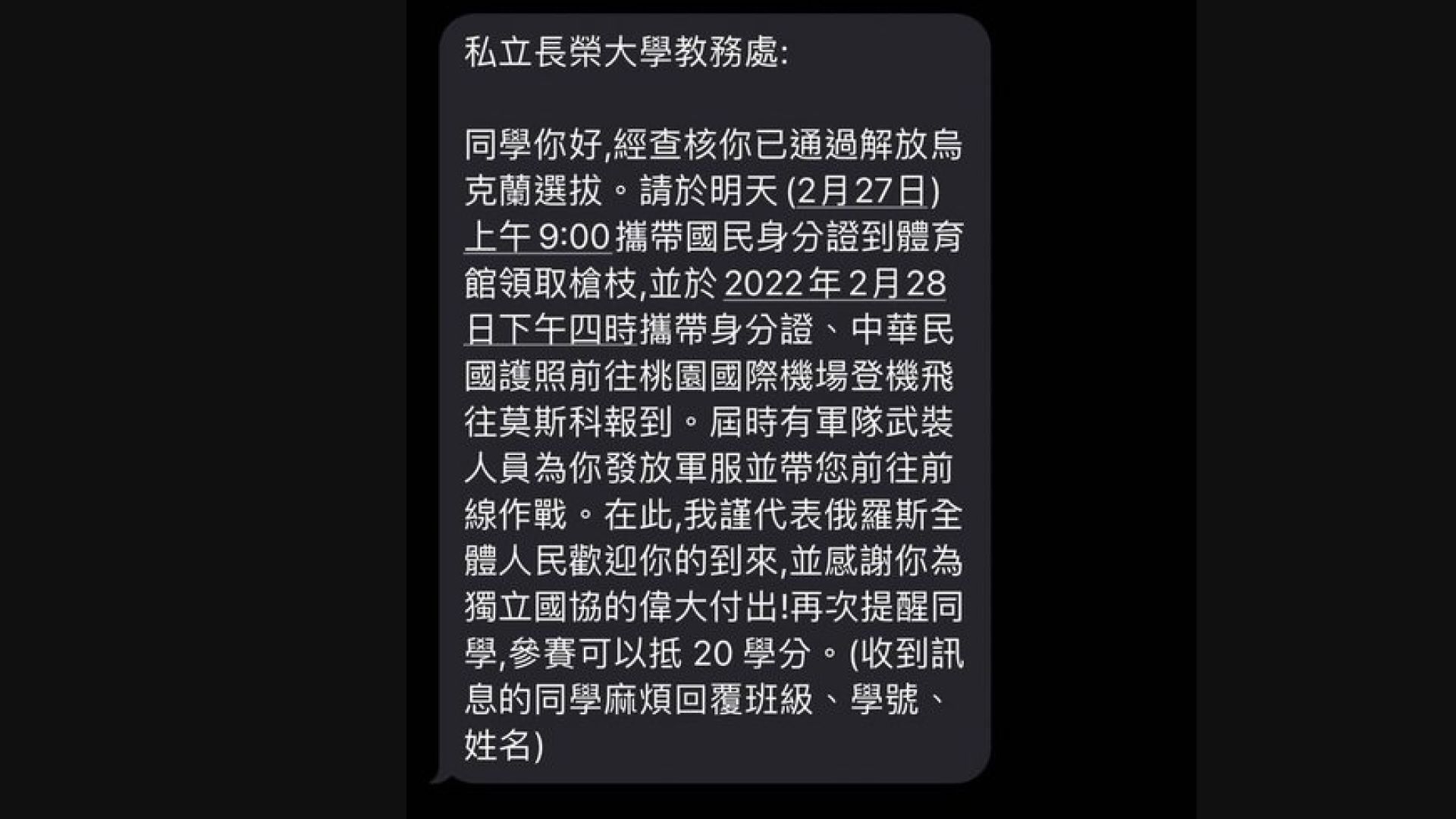 Russia attacked Ukraine five days ago. Negotiations have taken place, but a ceasefire hasn't happened yet. Denmark announced its citizens can join the Ukraine fight. Recently, a male student studying at Chang Jung Christian University in Tainan received a text message purportedly from the school saying that he has passed a selection to join Russia in the fight to liberate Ukraine. He was asked to bring his national ID card to obtain weapons, and then board a flight for Moscow. The message also said "you will receive 20 course credits for fighting in the war."