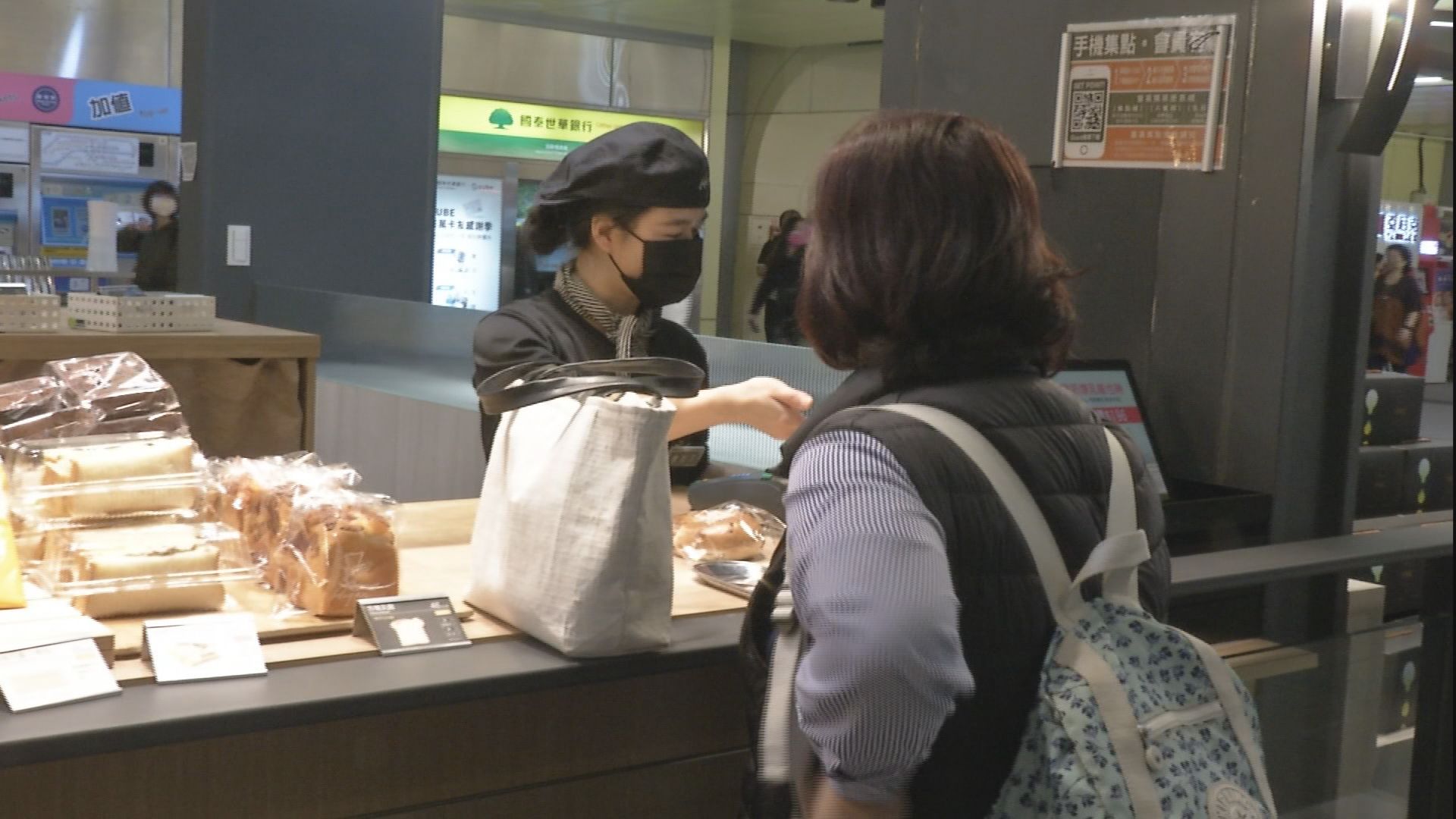 一早搭乘捷運的旅客,在捷運通道準備換線轉乘的路上就有一整排的商店,其中以咖啡和麵包,最受上班族青睞。