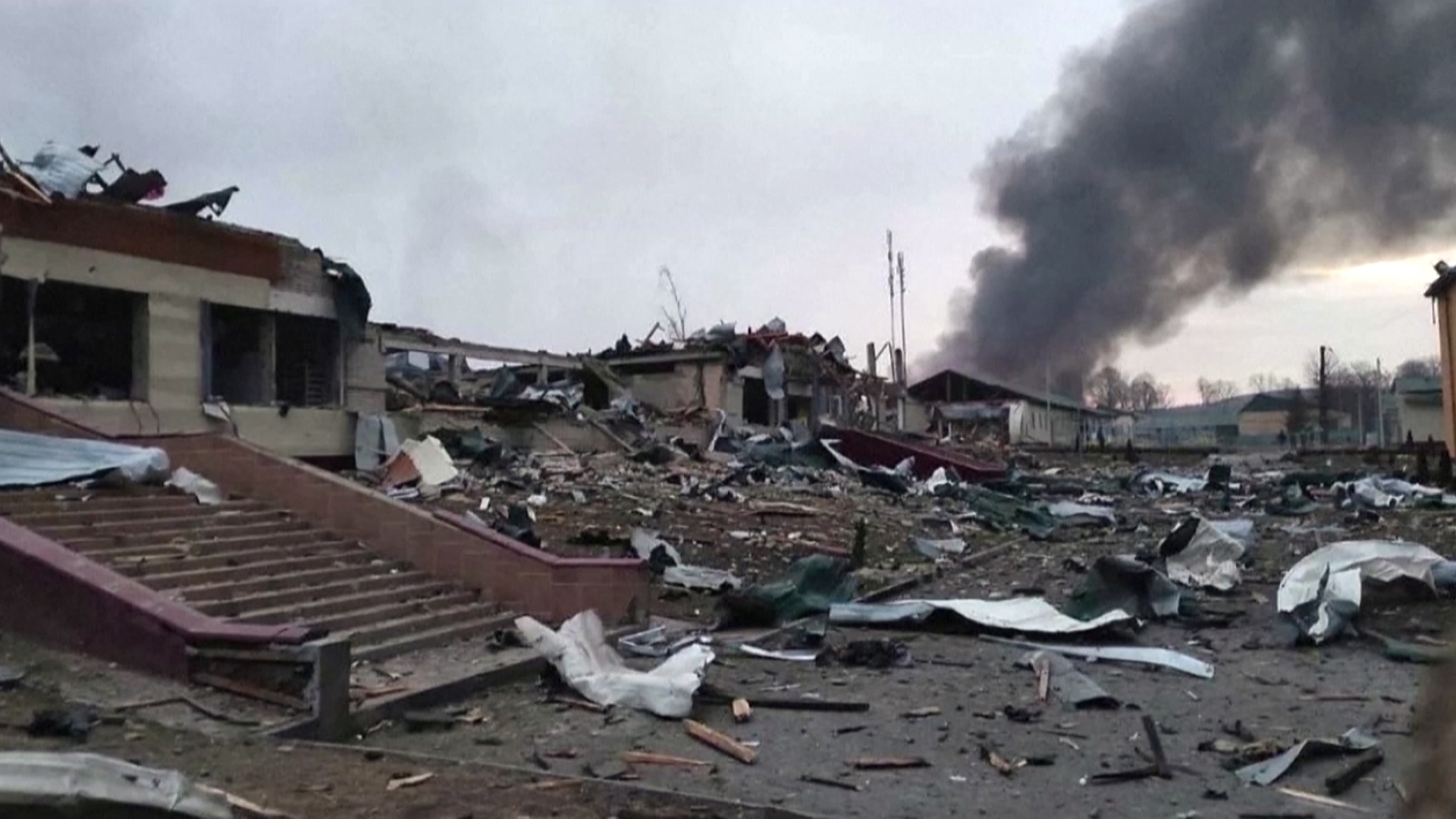 在距離波蘭邊境25公里,位於烏克蘭西部亞沃利夫這處軍事基地有幾座建築物倒塌,並可見濃煙上竄,烏克蘭宣稱俄軍朝靠近北約成員國波蘭邊境的軍事訓練基地發射多達30枚導彈並造成死傷。