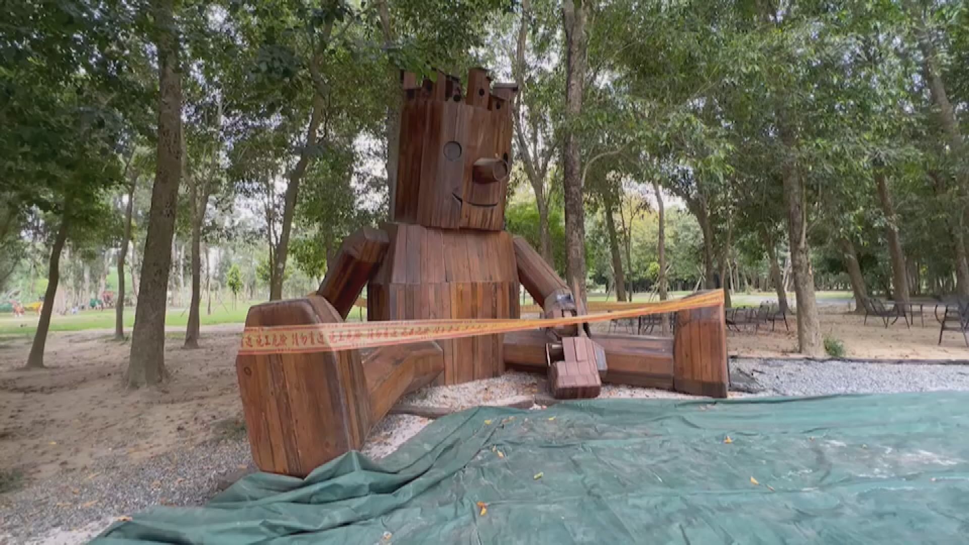 親子沙坑小木偶裝置藝術已啟用2年多,因長期放置戶外受風吹日曬,木頭早有脆化現象,所以會經常派人維護。先前已有類似案例,因此園方也製作「禁止攀爬」警語,沒想到還是有遊客視而不見,如今再度發生,園方也希望這名遊客能夠主動跟園方聯絡,儘速討論維修事宜。