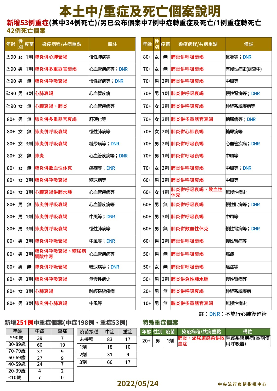 指揮中心表示,今日本土新增共251例中重症病患,中症198例、重症53例,另有死亡42例個案。