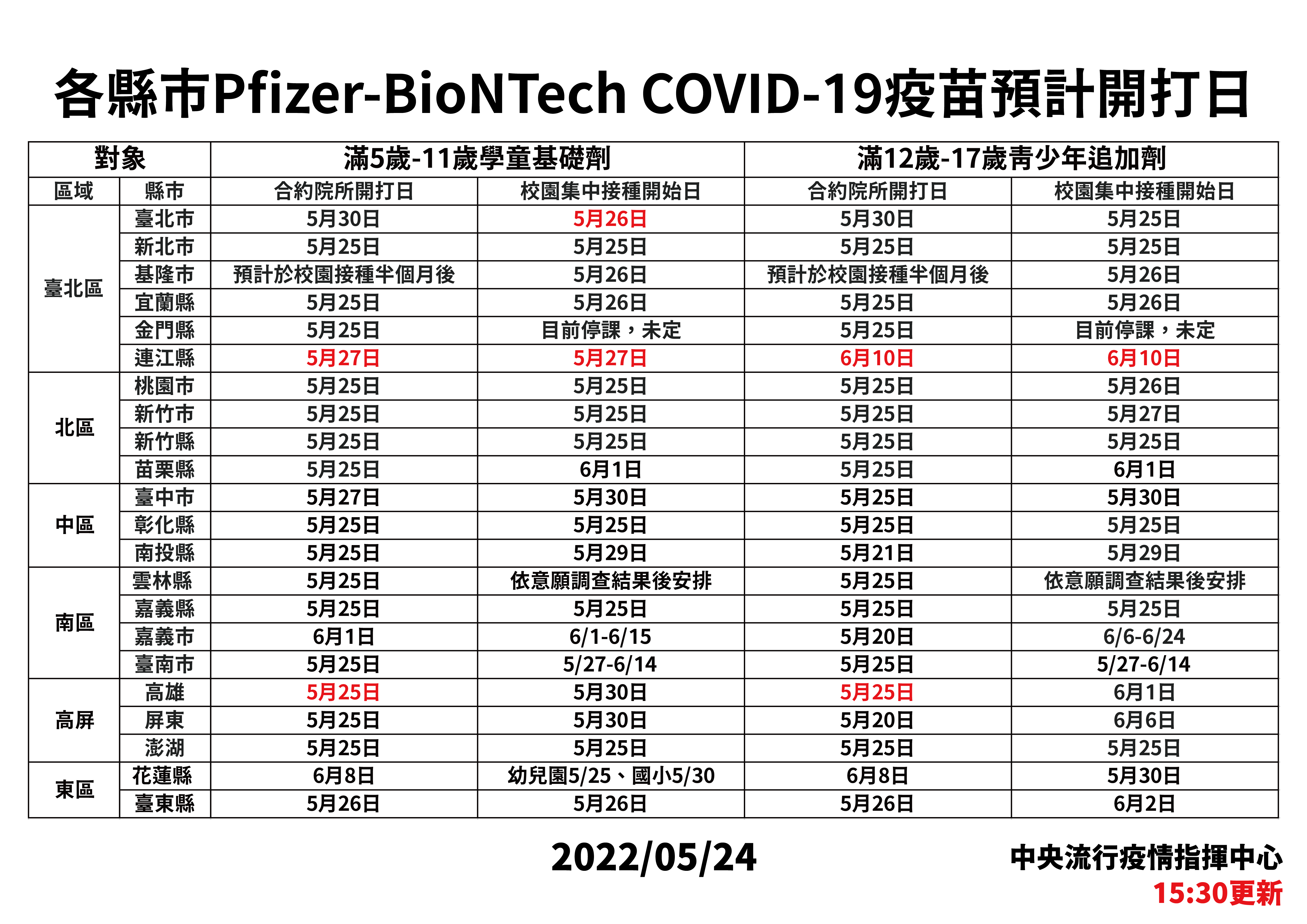 指揮中心宣佈,自5月25日起,依校園或各地政府安排合約醫療院所時間,開打滿5至11歲兒童接種BNT兒童疫苗和12歲至17歲青少年追加劑。