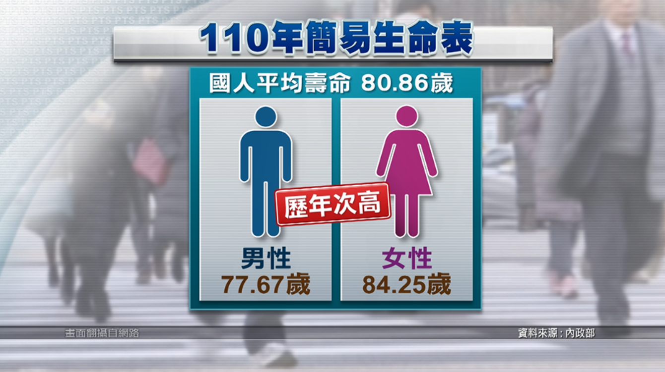 臺灣民眾是愈來愈長壽,內政部公佈110年的平均歲數是80.86歲,其中查埔77.67歲、查某84.25歲,查埔查某的歲數攏有增加。其中臺北地區較長歲壽,往南就會較降。