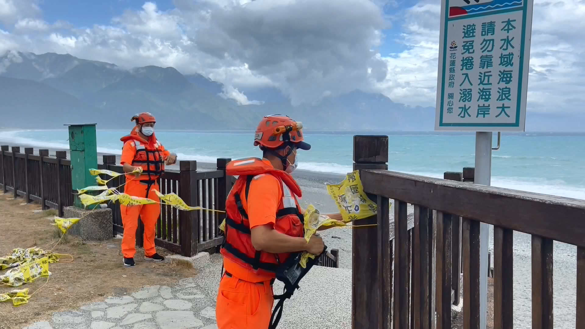 Hualian Coast Guards set up a blockade in the Cisingtan Scenic Area to prevent the public from approaching after the CWB issued a sea warning. Typhoon has brought strong winds and waves to Taitung's Green Island and Orchid Island. Waves pummeled the promenade along the Fugang coast. For the first time, The East Coast National Scenic Area Administration has integrated nine live-feed cameras in the East Coast area to provide the public with an understanding of wave conditions to stay away from dangerous waters.