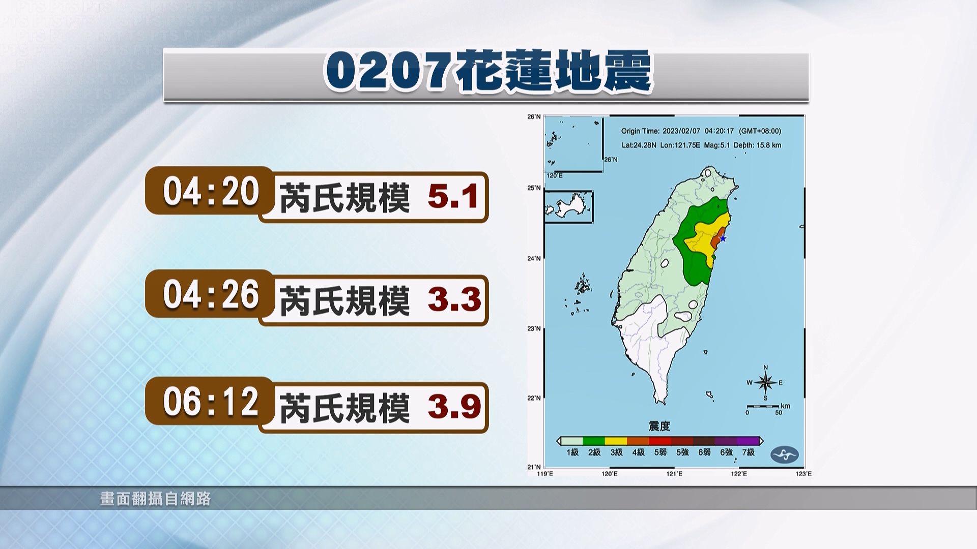 清晨4時20分,花蓮近海發生芮氏規模5.1地震,宜花部分區域最大震度4級,全台16縣市有感,緊接著於4時、6時許,當地又再度發生兩起地震,不過規模都沒有超過4。