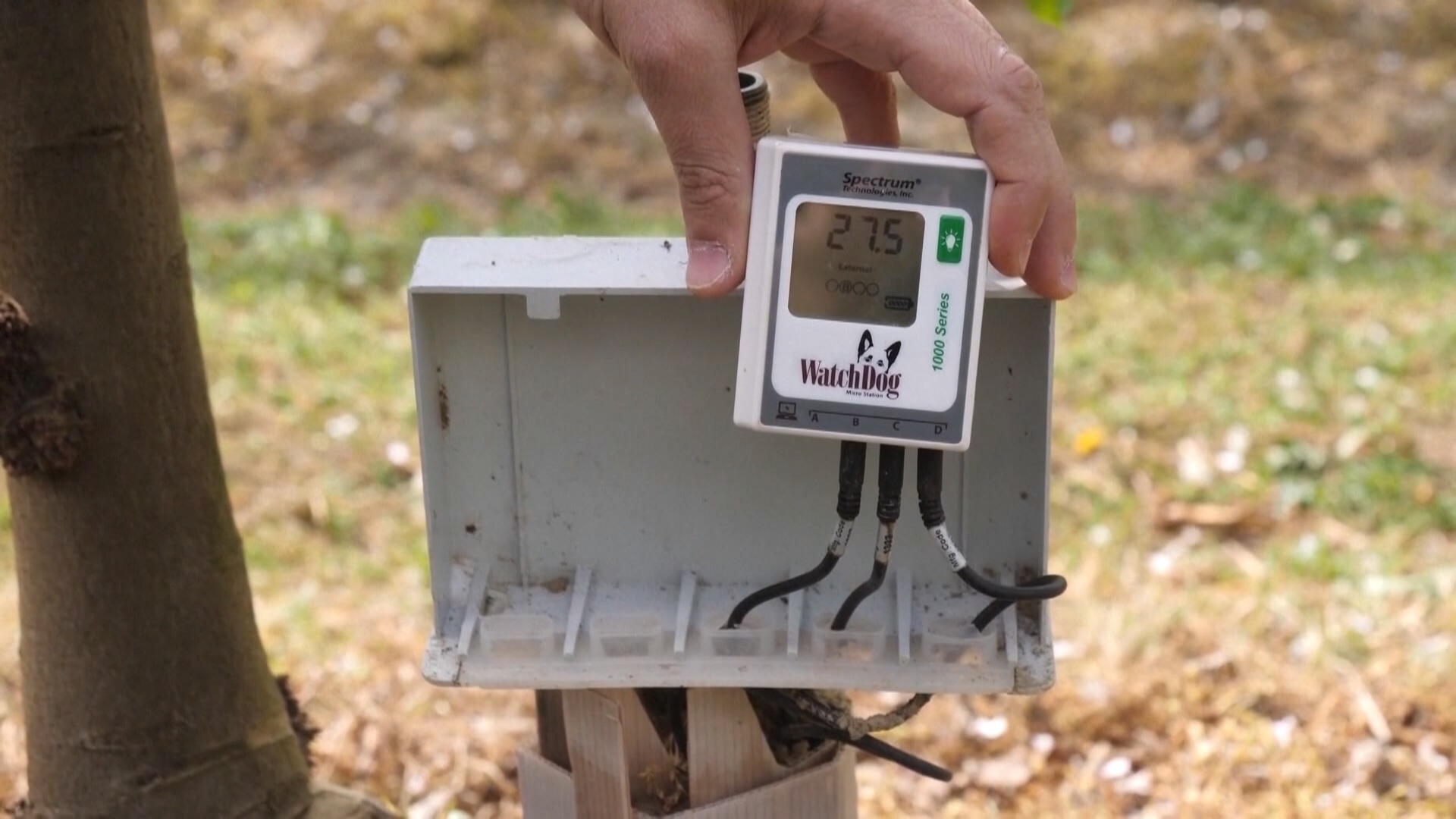 布德里奧的農業研究與實驗中心工程師手中操作的這台無人機,能從空中有效的偵測作物樹葉的含水量;安裝在作物樹皮上的感應器,可以準確掌握作物到底從土壤中吸取多少水分,然後透過滴灌系統,定時、定量地精準給水。