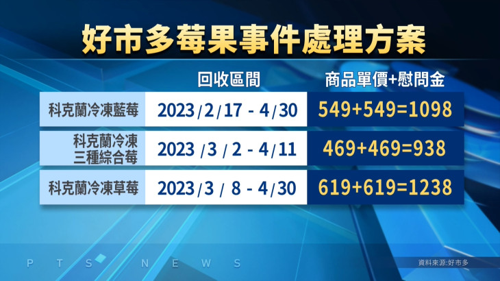 美式賣場好市多的莓果類產品又被驗出有A肝陽性的情況,食藥署公布下架的莓果產品中,墨西哥生產的「科克蘭冷凍草莓」被驗出A肝病毒污染,目前只回收了1402公斤,還有1500多包,超過4000公斤流入市面。食藥署強調,在好市多完成補件之前,會暫停受理相關的產品輸入報驗;而消保處表示,已經收到51件的消費者申訴達到團體訴訟門檻,衛福部也會協助團體爭取訴訟費用補助。