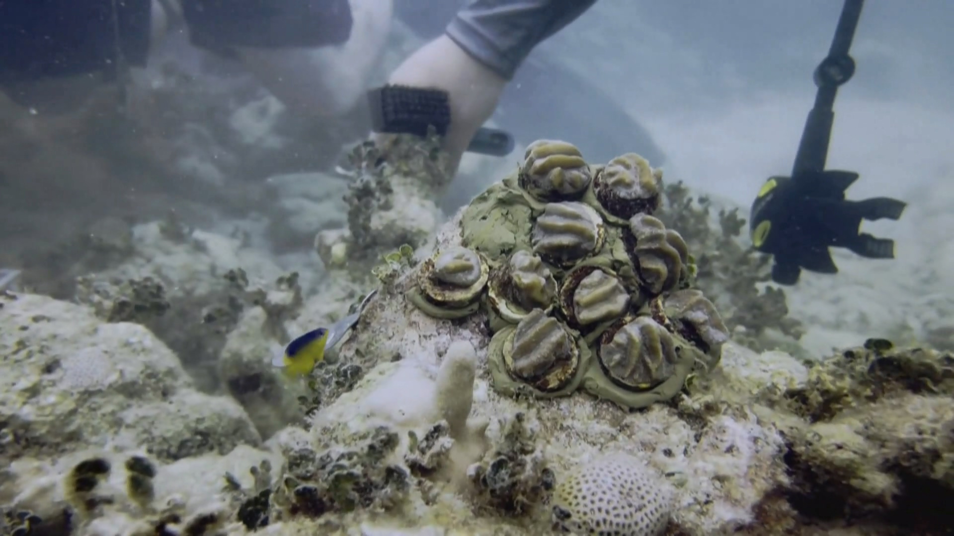 潛水員們拿起鋼刷,刮掉珊瑚礁上面的碎片,塗上黏著劑。在一小時的復育計畫裡,他們總共移植了超過1000株的珊瑚苗。