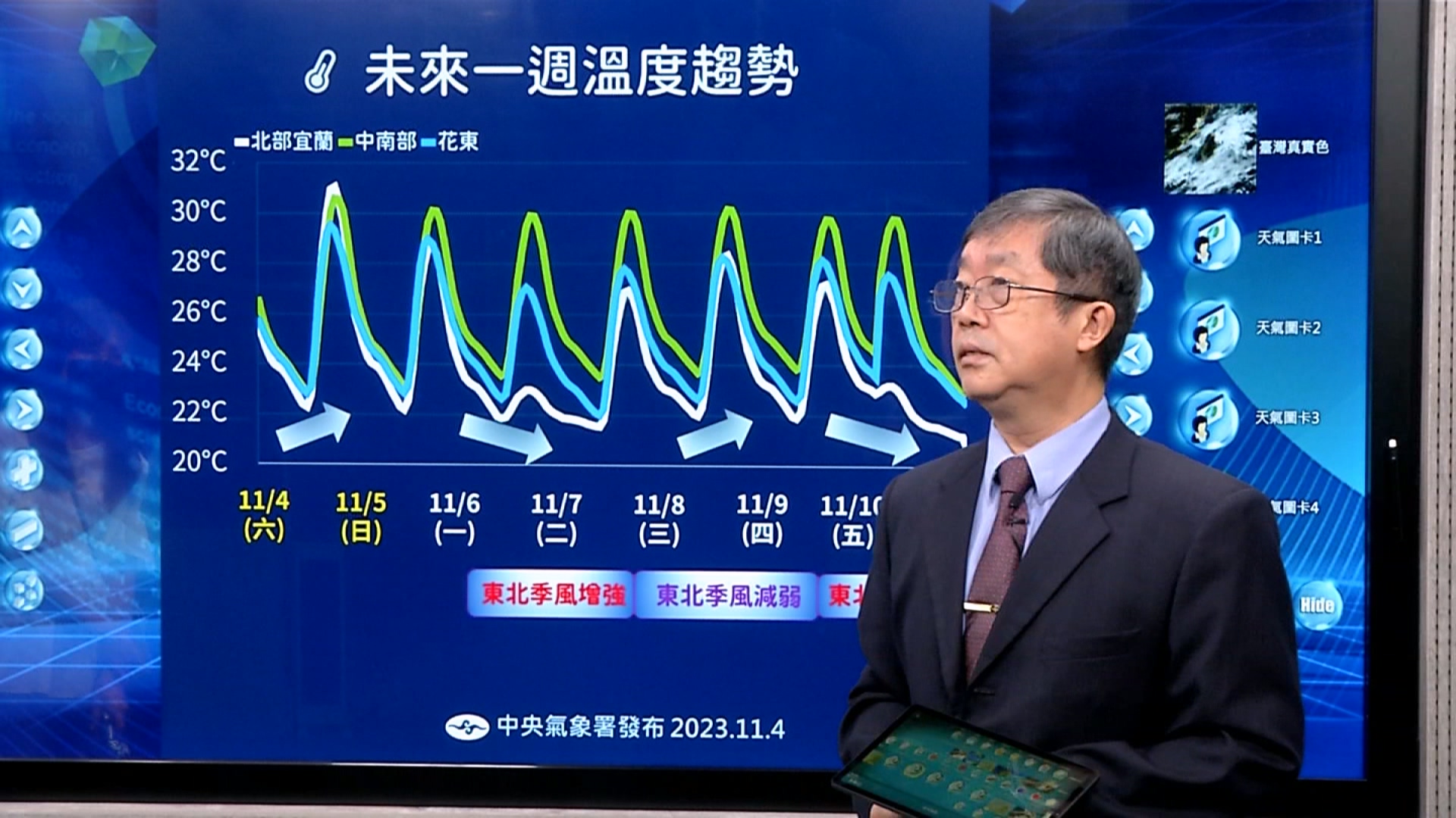 中央氣象署預報員曾昭誠說明,「目前看起來冷空氣的強度有稍微,比較沒有正對著台灣,沒有那麼強。禮拜二到禮拜三清晨這段時間,台灣北部的低溫大約是落在18度上下。」