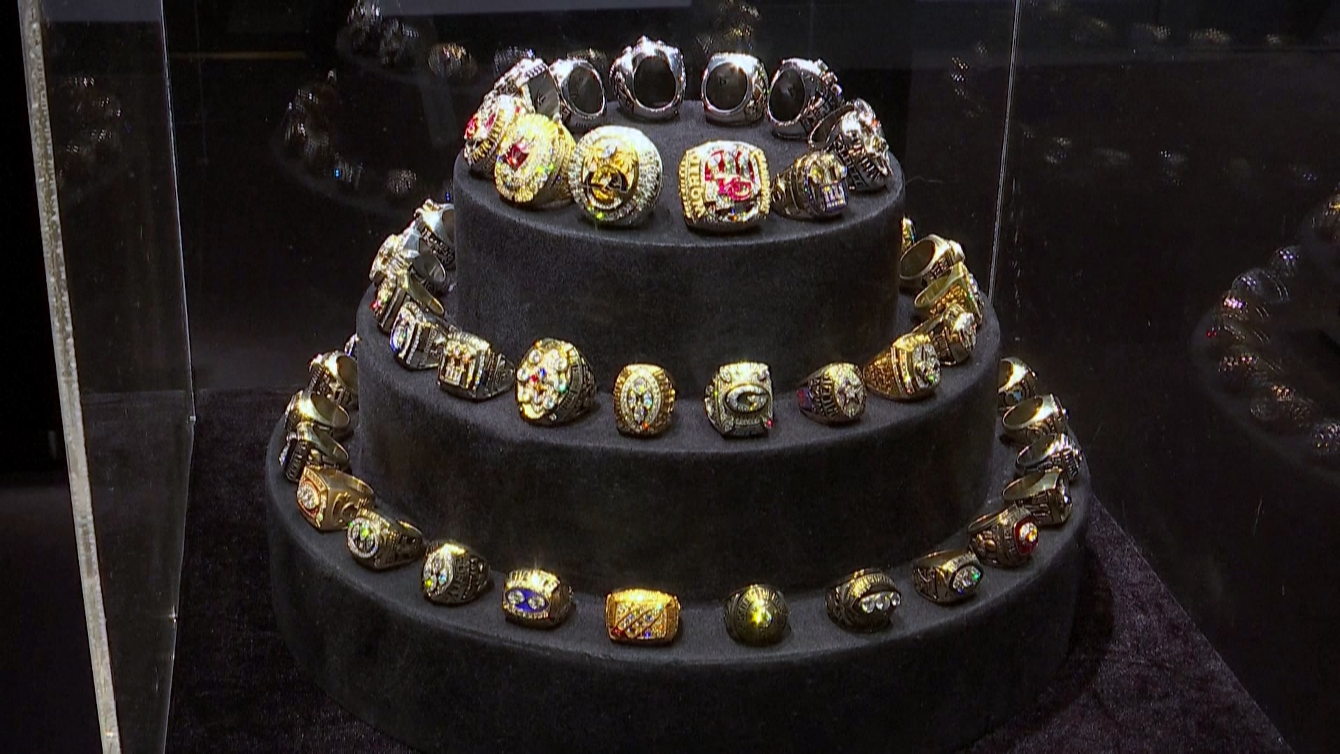 展示台內擺滿3排戒指,每一枚都代表當屆美式足球超級盃冠軍,上頭用鑽石刻著歷屆冠軍球隊。