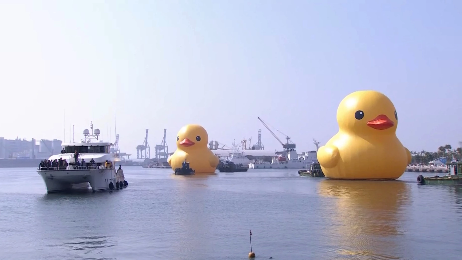 ประชาชนส่งเสียงให้การต้อนรับ เป็ดน้อยสีเหลืองกลับมาถึงนครเกาสงแล้ว หลังจาก 10 ปีก่อนหน้านี้มีเพียงตัวเดียว ครั้งนี้เป็ดน้อยสีเหลืองกลายเป็น 2 ตัว