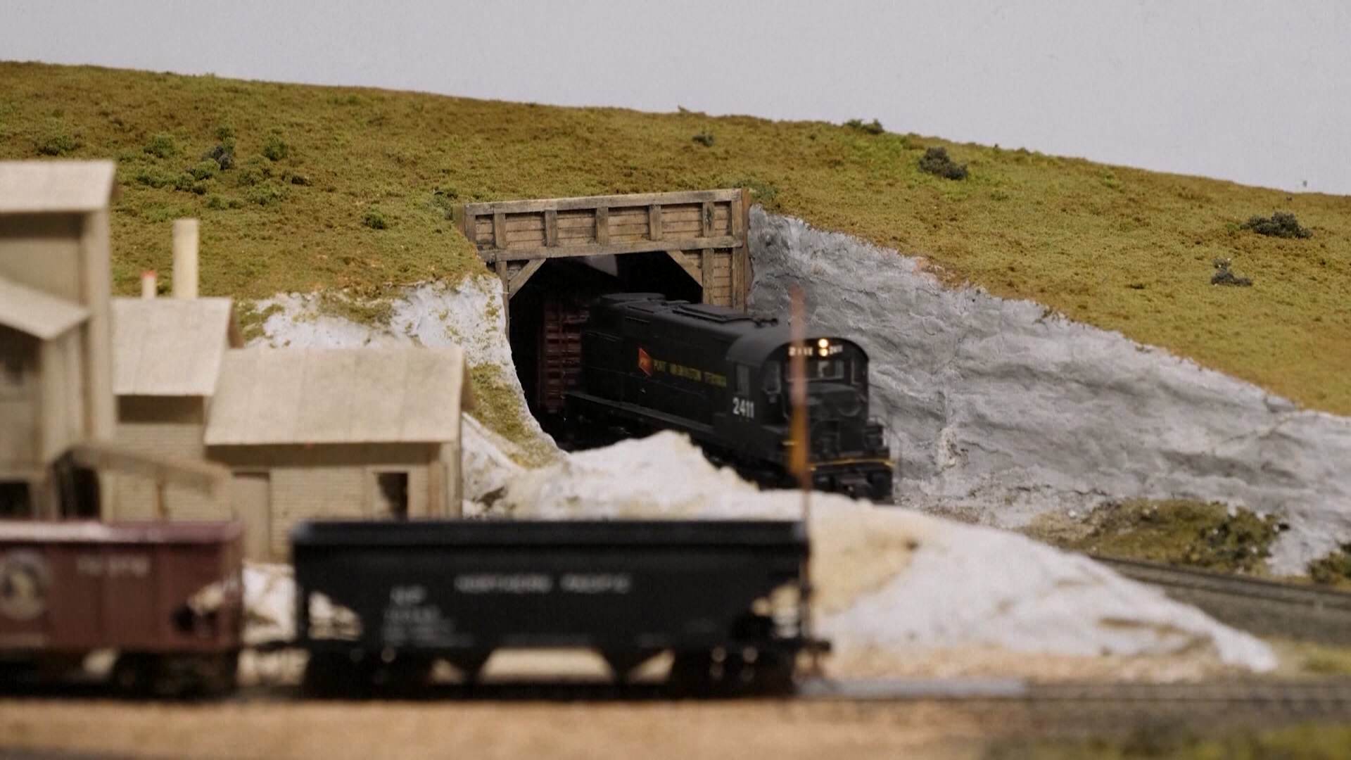 柴油機車頭拉著1列貨車車廂緩緩駛出隧道,製作並操控這組火車模型的艾佛瑞特還特地戴上船長的帽子準備操作駁船模型,把貨車車廂帶離假想的碼頭。