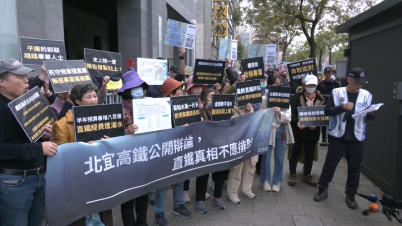 反對高鐵延伸宜蘭的代表,高喊「停審神話高鐵」口號,重申若堅持推動,將造成高鐵台鐵雙輸,監督聯盟指出,報告中提及的旅行時間節省效益,忽略轉乘與候車時間,實際看西部高鐵,顯示高鐵台中與新烏日、高鐵台南與沙崙轉乘,至今仍難以無縫銜接。