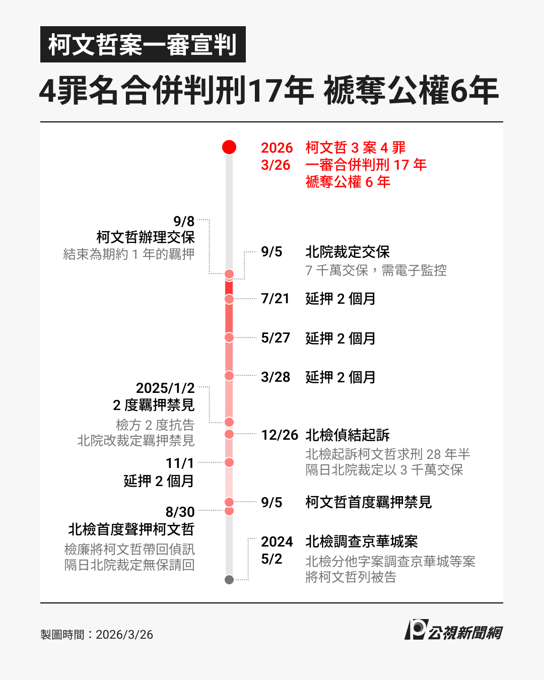 民眾黨前主席柯文哲因涉入京華城等案,2024年12月被檢方起訴並求刑共28年6個月,北院26日下午一審判處柯文哲有期徒刑17年,並褫奪公權6年。《公視新聞網》為您回顧此案重要事件時間軸,以及柯文哲被控的3案件4項罪名。