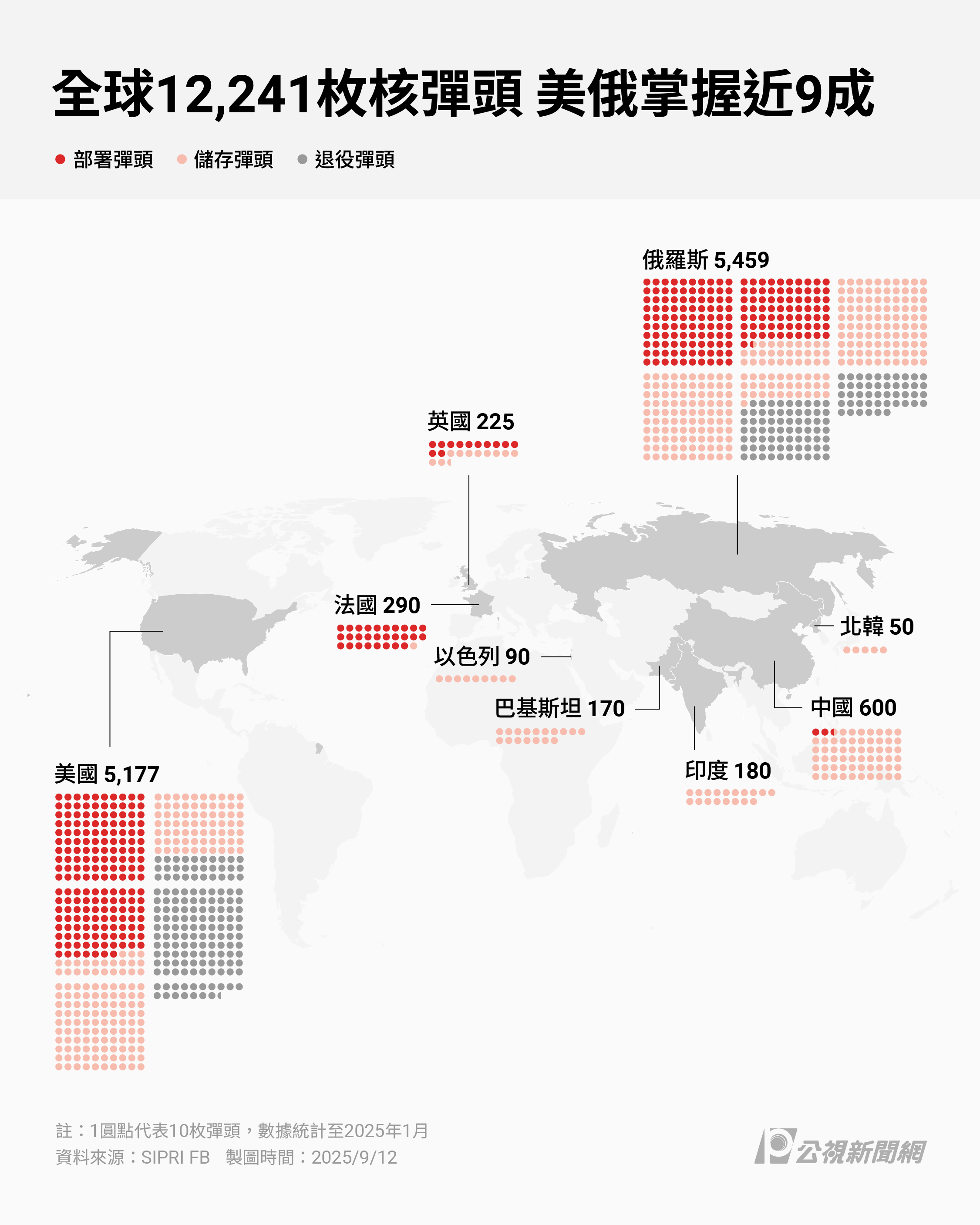 瑞典智庫斯德哥爾摩國際和平研究所(SIPRI)發布《2025全球核力量年鑑》指出,截至2025年1月,全球目前約有1萬2241枚核彈頭,其中9614枚屬可供實際部署的軍事庫存,且約有2100枚已搭載在彈道飛彈上,代表處於高度戰備狀態。
