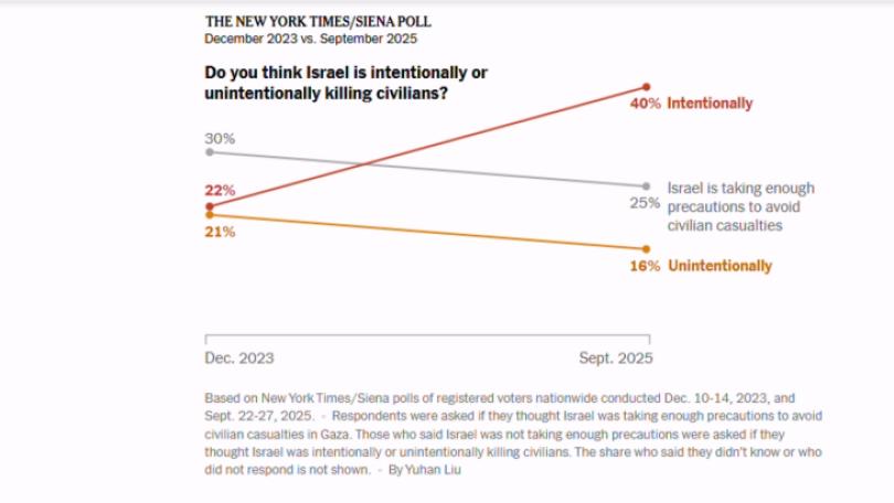 根據《紐約時報》的民調,51%的美國民眾,反對國家繼續給予以色列額外的軍事和經濟援助,而且對於以色列的支持度已經掉到34%。至於對巴勒斯坦民眾的同情略升到35%,但也有40%的美國民眾認為,以色列是故意殺害巴勒斯坦平民。