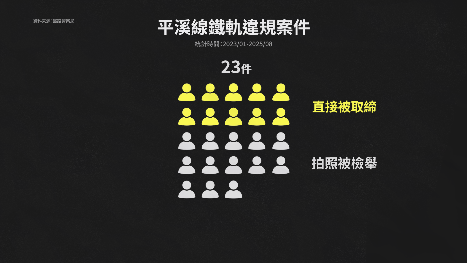 鐵道局統計資料顯示,2023年至今年8月,鐵路警察移送的平溪線鐵軌違規案件總共有23件,其中10件是在鐵軌上施放天燈直接被取締,另外13件是在鐵軌上拍照,放到社群媒體,被人檢舉。