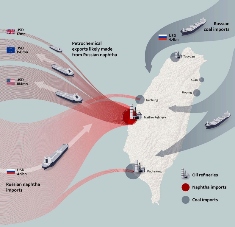 《金融時報》報導,台灣在2025年上半年共從俄羅斯進口價值達13億美元(約台幣390億元)、總重量190萬噸的輕油(Naphtha),成為俄國該出口品的全球最大進口國。這則報導根據的研究內容,是由芬蘭智庫(Crea)及俄羅斯、德國與台灣非政府組織環境權保障基金會共同發表。
