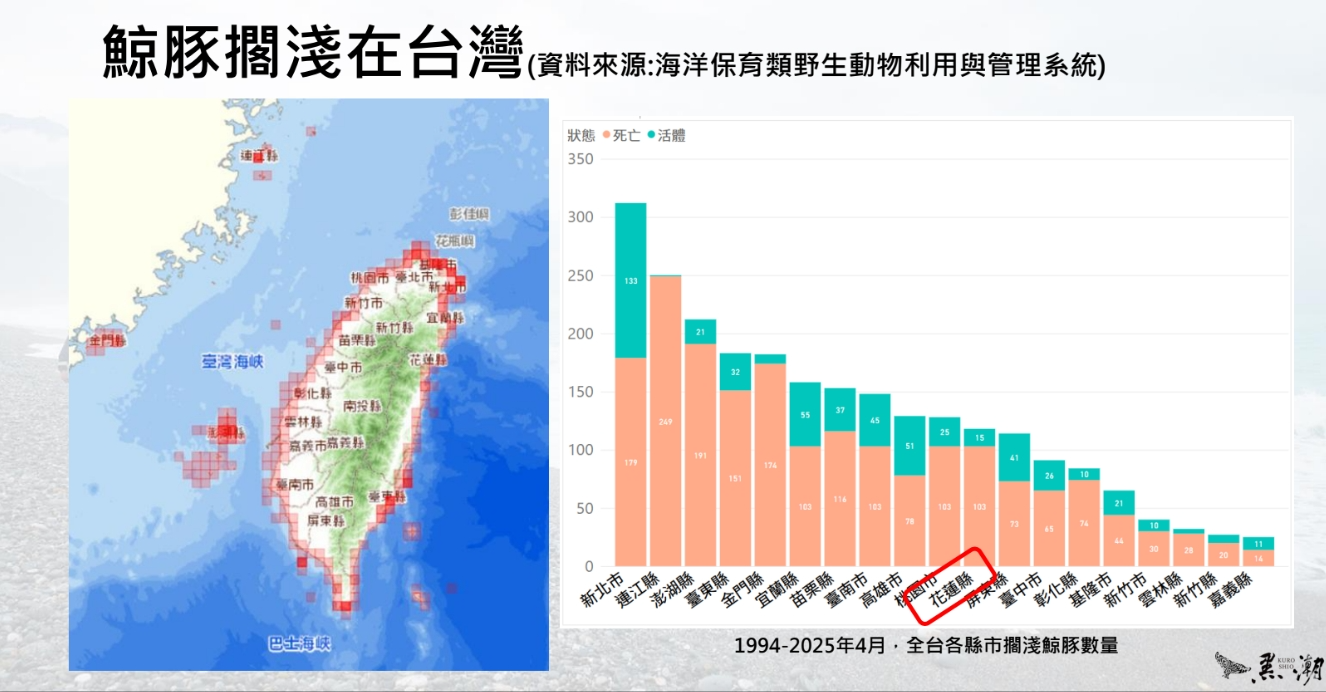 根據統計,台灣鯨豚擱淺紀錄遍及全台沿岸,其中以新北市、連江縣最多;至於花蓮擱淺數量雖然不算多,但擱淺的鯨豚種類多,除較常見的弗氏海豚、瑞氏海豚之外,也曾有小抹香鯨、小虎鯨擱淺的紀錄,是監測海洋環境的重要資訊。