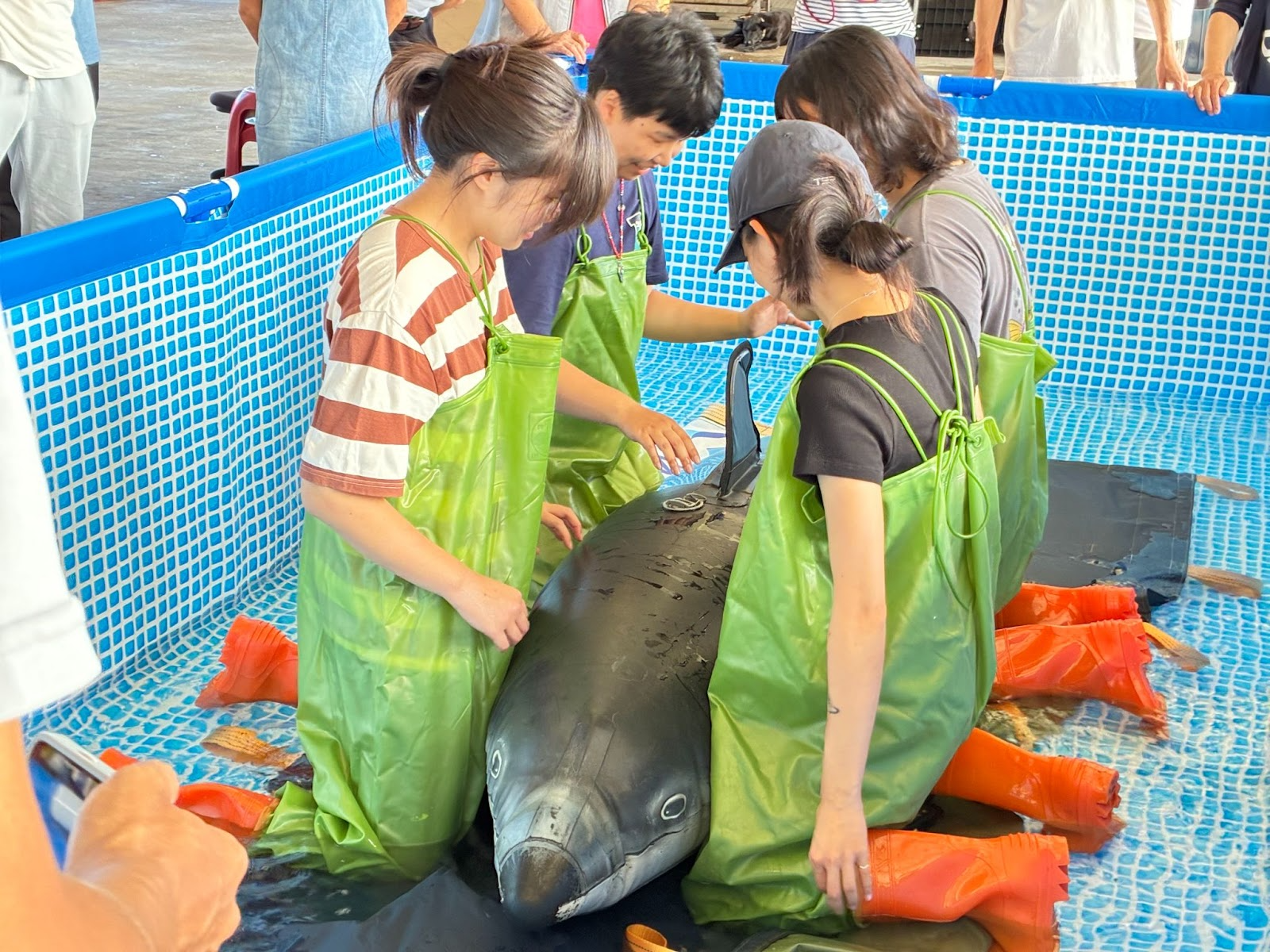黑潮基金會與鯨豚協會攜手舉辦課程,讓學員模擬演練遇到待救援鯨豚時,應如何在岸邊先給予初步照護,以及實際使用器材搬運、搭建水池,和為鯨豚測量體重等,盼藉此培養更多民眾成為救援即戰力、增加救援志工人手。